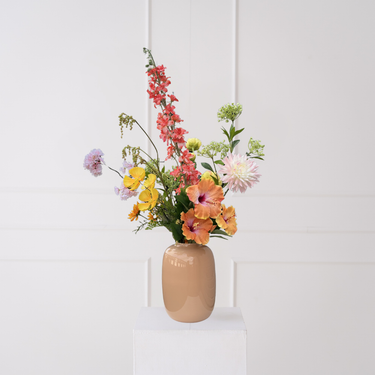 Boeket Juni komt het mooist tot zijn recht in een hoge vaas met een smalle hals, waardoor de vormen en kleuren extra goed naar voren komen.